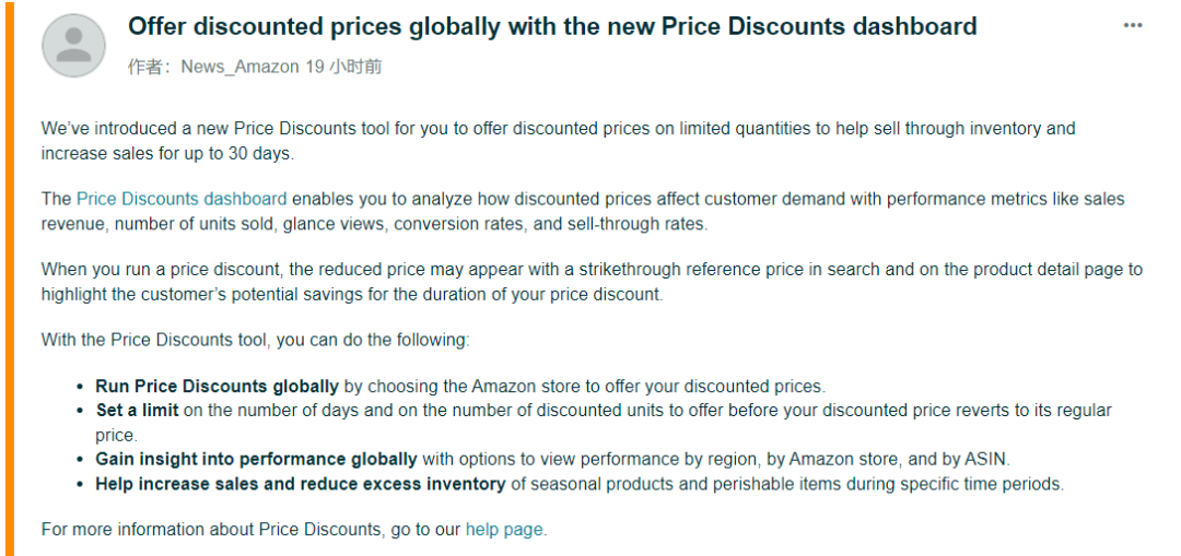 根据亚马逊介绍,卖家可以用这款工具对有限数量的产品提供折扣价,帮助销售库存并增加销售额,最长可以持续30天。通过价格折扣仪表板,卖家可以利用销售收入、销售数量、浏览量、转换率和销售通过率等性能指标,分析折扣价格是如何影响客户需求的。