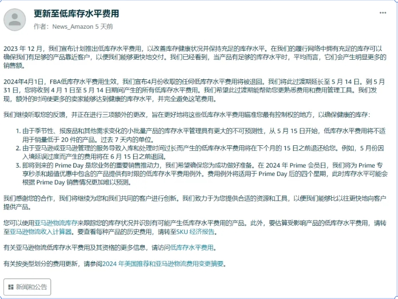 可能是因为卖家抗议的声音太多,后续亚马逊再度发布公告,宣布将为该项新政的施行提供为期一个月的过渡期。即:4月1日~4月30日期间产生的FBA低库存水平费亚马逊仍会收取,但会在月底返还至卖家账户。